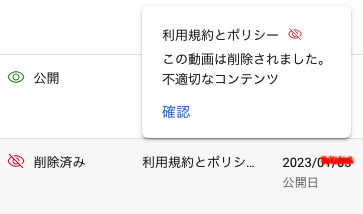 3. 「公開設定」に「削除済み」と表示されている動画を見つけます。「制限」欄に理由が書いています。そこにカーソルを合わせます。「確認」をクリックします。