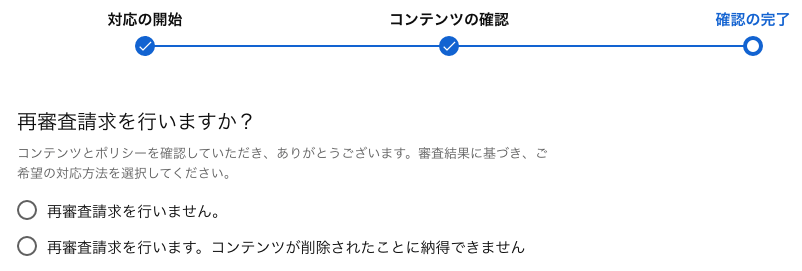 6. もし動画に問題がない場合、「確認の完了」タブに入り、「再審査請求を行います。コンテンツが削除されたことに納得できません」を選択し、「送信」をクリックします。