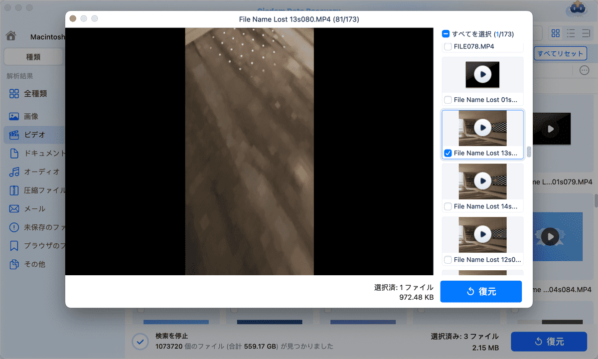 「スキャン」をクリックして、Macで削除されたYouTube動画を探します。左のカラムで「種類」タブに移動し、「動画」をクリックして右のウィンドウで「MP4」ファイルを表示ます。あるいは、