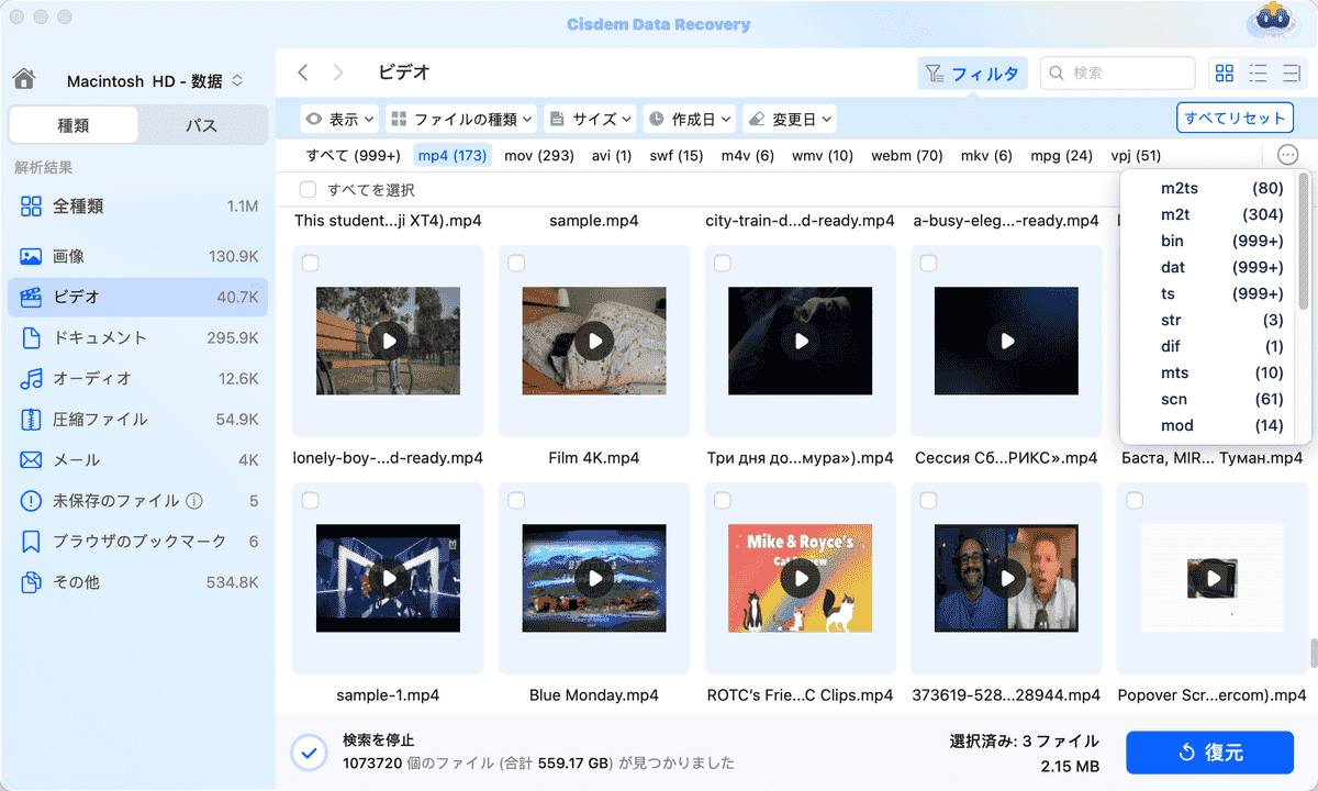 Cisdem Data Recoveryは強力で使いやすいデータ復元ソフトで、内蔵HDDや外付けHDDで削除された/フォーマットされた/消えた様々なファイルを復元してくれます。復元成功率は95%以上あり、削除されたYouTube動画を復元成功の可能性が大きいです。